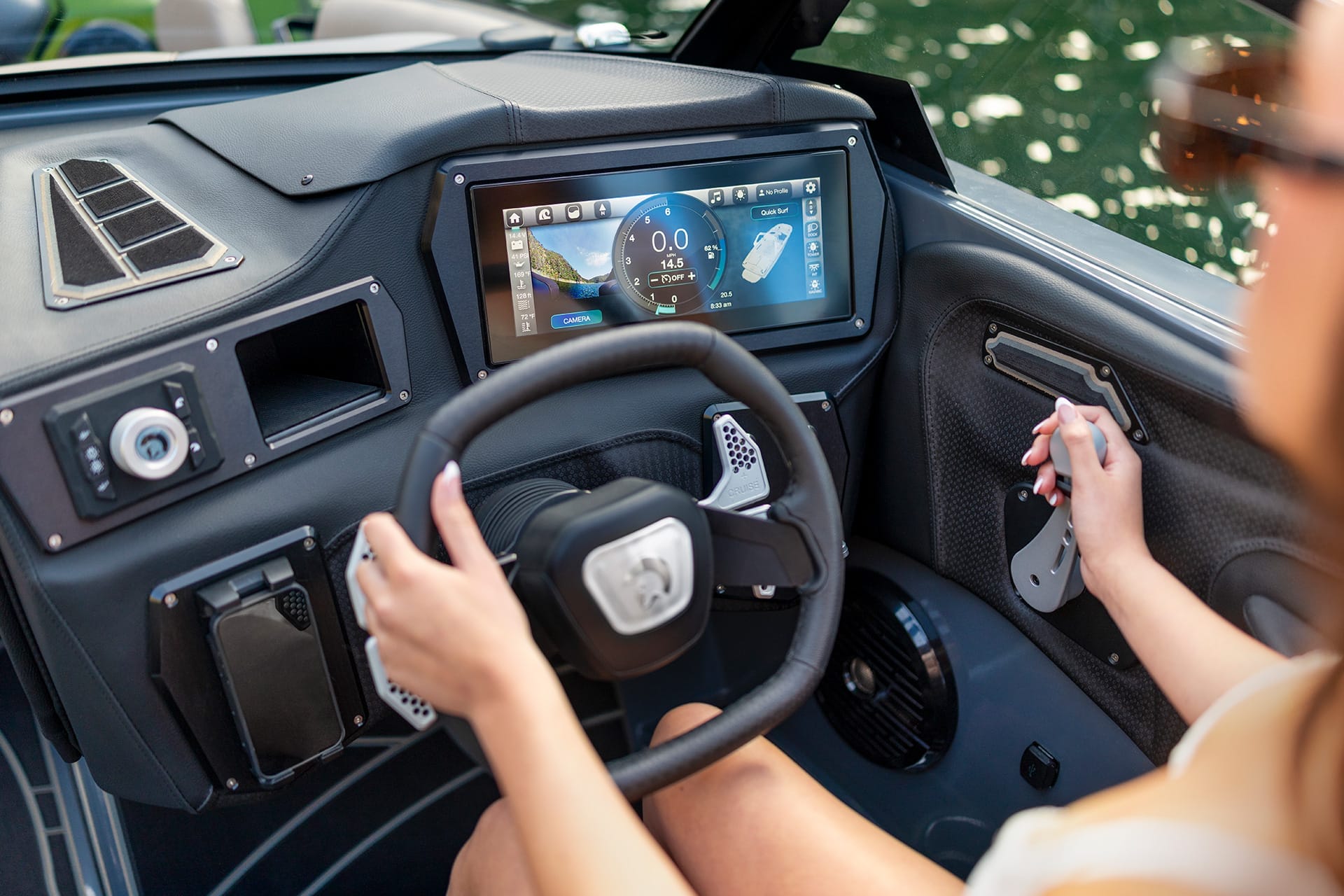 Four heavy-duty Linak actuators, each rated for 2,200 pounds, operate synchronously for smooth, stable motion. Integrated storage hangers keep wet towels, vests, and ropes organized and off seating areas, while downlighting enhances visibility during evening sessions. The 2026 model introduces an HD digital camera integrated into the tower structure, providing the driver with real-time visibility of activity behind the boat. Features include a convertible bimini with zip-open sections for additional sun exposure, BombShell 2.0 board racks, and optional high-performance audio systems. This tower combines aggressive styling with functionality that outperforms the competition.